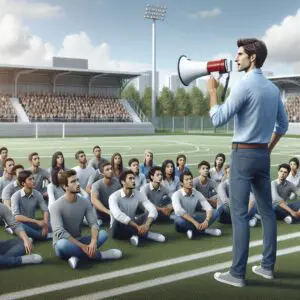 Image created with DALL-e (MS Designer) using prompt: “A realistic picture of a young casually dressed male leader with a megaphone speaking to a group of about 40 employees on a football field. Size 1200 x 629 pixels,”