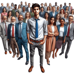 Images for this block created using DALL-e, Microsoft Designer, with prompt: A group of diverse standing adults surrounding a single young businessman, all casually dressed, with all staking at once. Photo-realistic image with ragged edges and transparent background.